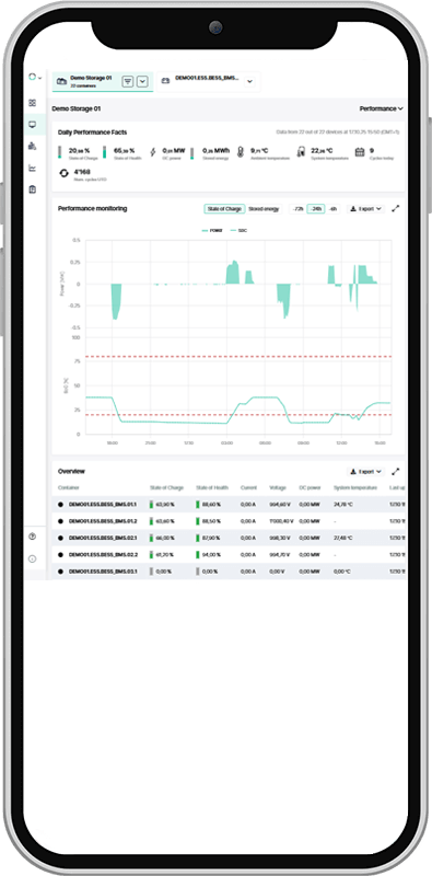 Explore site-wide performance and trends over time at your BESS site. Drill down to individual containers to assess energy throughput, charge/discharge behavior, SOC patterns, cycle counts, and state of health evolution. This layered visibility empowers smarter decisions and long-term asset optimization.